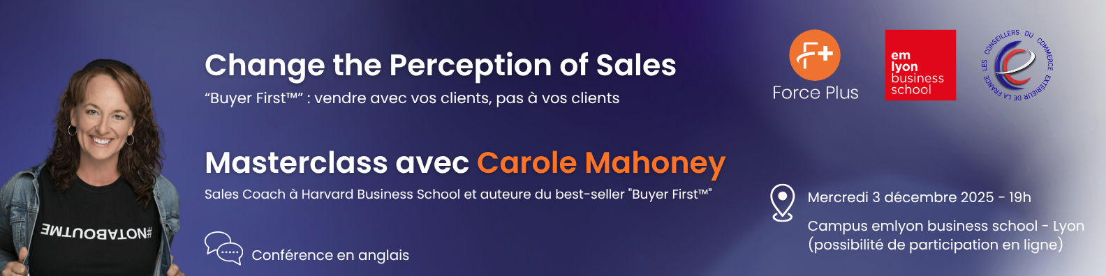 Dans cette masterclass de 90 minutes, Carole Mahoney (Sales Coach à Harvard Business School et auteure du best seller « Buyer First™ ») partage son approche cognitive-comportementale basée sur les neurosciences et les données recueillies auprès de 2,4 millions de commerciaux.